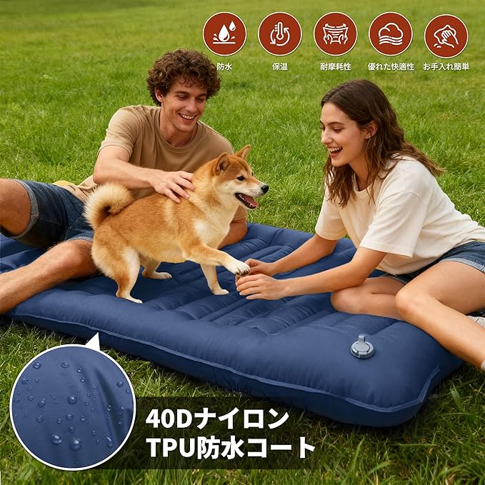 【耐荷重150kg&耐久耐摩耗性】足踏み式エアーマットは40Dナイロンを使用し、TPUの防水防湿コーティングが施されています。耐摩擦性に優れ、石や枝の上でも破れにくい。防水加工で突然の雨や朝露でも中まで濡れず、汚れもサッと拭き取れるので清潔です。最大耐荷重は150kgで、家族や友人と一緒に使っても安心してアウトドアを楽しめます。補修用パッチは3枚も付きなので、万が一のときも安心です。