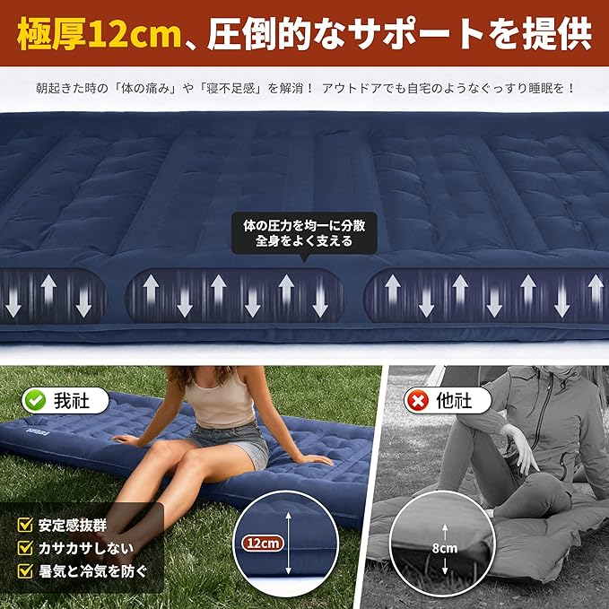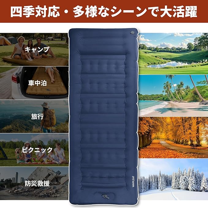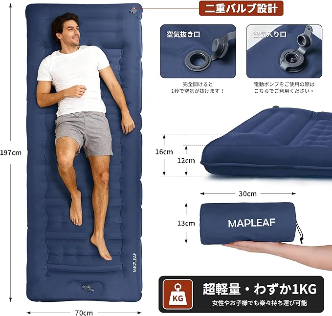 【12CM厚さ】Mapleaf エアーマット 足踏み式 枕付き フットポンプ内蔵 車中泊 防災 お花見に 厚手 コンパクト 軽量 防水 保温 持ち運び便利 補修テープ付 登山 公園 ビーチ テント キャンプ 来客用 仮眠用 収納袋付 | KAZESHOP