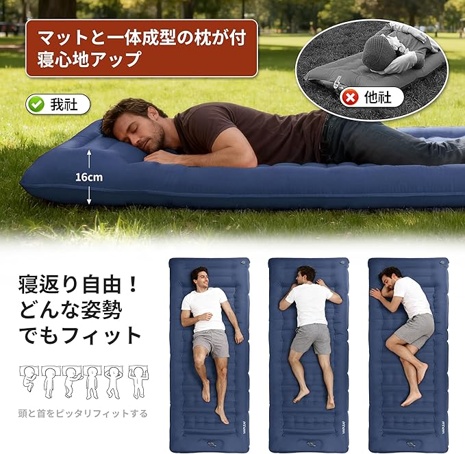 【枕付きで寝心地アップ】従来のエアマットのように枕がずれたり、高さを調整する手間なし!マットと一体成型の枕が人間工学に基づいた設計で、自然な首の角度をキープ。寝返りを打っても頭が安定し、目覚めがスッキリ!最大16cmの高さまで調節可能!別売りの枕を用意する必要がなく、収納時もかさばらないので、荷物を最小限に抑えたい方に最適です。