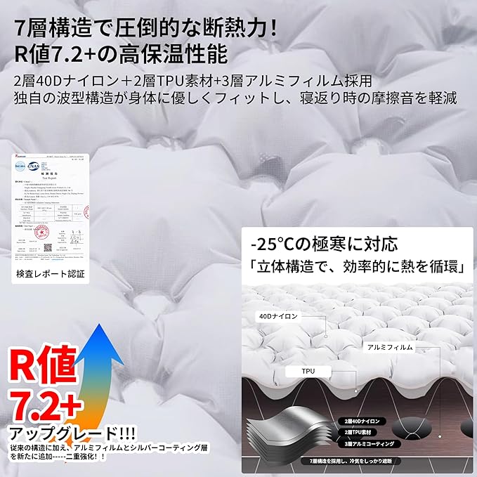 【高断熱性能・R値7.2の安心保温力】✅R値7.2以上の高断熱エアマット。✅従来のエアマットとは一線を画す7層構造を採用し、内部には3層のアルミフィルムを封入。これにより地面からの冷気をしっかり遮断しつつ、体温を反射して暖かさをキープ。反射効率90%以上の構造で、-25℃の極寒環境でも快適に使用可能です。寒冷地での冬キャンプや雪中泊にも最適な、高レベルの断熱性能を実現しました。