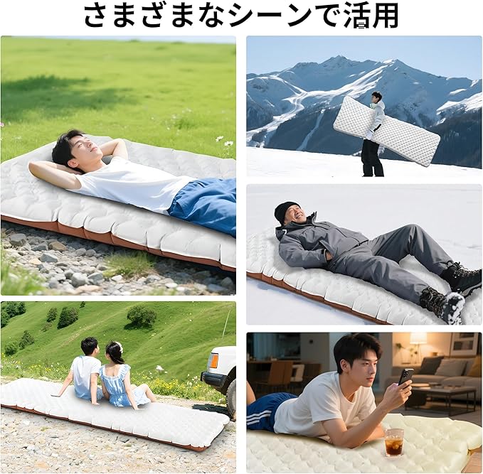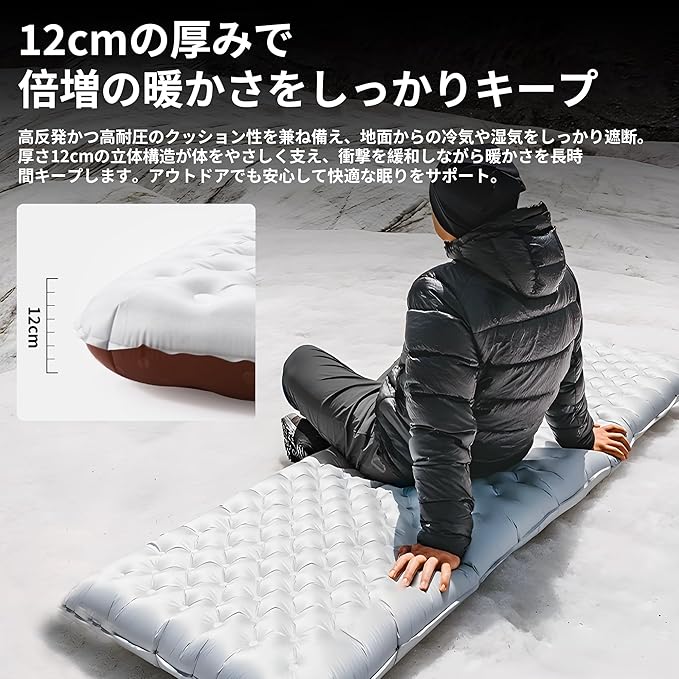 【12cm極厚エアマットで快適な寝心地を実現】✅スペースフレーム構造により、約12cmの極厚設計を実現。一点に荷重が集中しても底付きしにくく、しっかりとしたサポート力で快適な寝心地を提供します。さらに、波型グルーブ構造が体に優しくフィットし、寝返り時の摩擦音を軽減。まるで自宅のベッドのような静かで落ち着いた睡眠環境を作り出します。✅高い弾力性・耐圧縮性・防湿性・耐衝撃性を兼ね備えた構造で、寒さにも強く、体をしっかり支えて深い眠りへ。使用時サイズは190cm 65cmとゆったり設計で、寝袋との併用や車中泊にも最適。ミニバンやワンボックスカーでも快適に使え、アウトドアの疲れをしっかり癒して翌日の活動に備えられます。