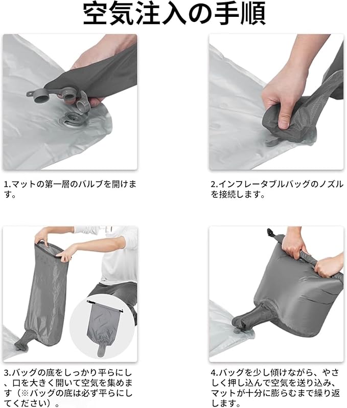 【ご使用方法】1.エアーマット本体の空気注入口(バルブ)を開けます。2.インフレータブルバッグの先端を、マットの注入口にしっかりと接続します。3.バッグの底面を広げて四角く整え、バッグの口を開いて空気を取り込みます。4.バッグをやや傾けながら、手で静かに空気を押し込みます。これを繰り返して、マットが十分に膨らむまで空気を注入してください。