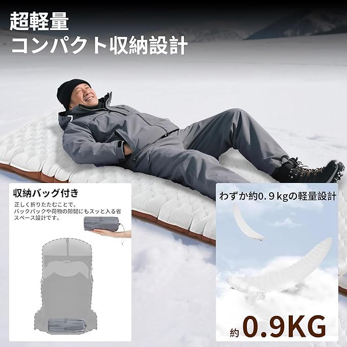 【超軽量&コンパクト設計のエアマット】✅わずか約0.9kgの軽量設計で、収納時は500mlペットボトルより少し大きい約26 12 12cmと超コンパクト。付属の収納袋に収めればザックの中でも場所を取らず、持ち運びも簡単です。✅キャンプやツーリング、登山などのアウトドアはもちろん、仮眠や急な来客時、災害時の備えとしても幅広く活躍します。荷物を最小限にしたいソロキャンプや縦走にも最適です。
