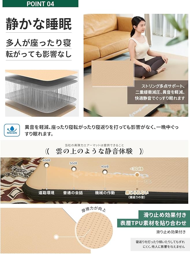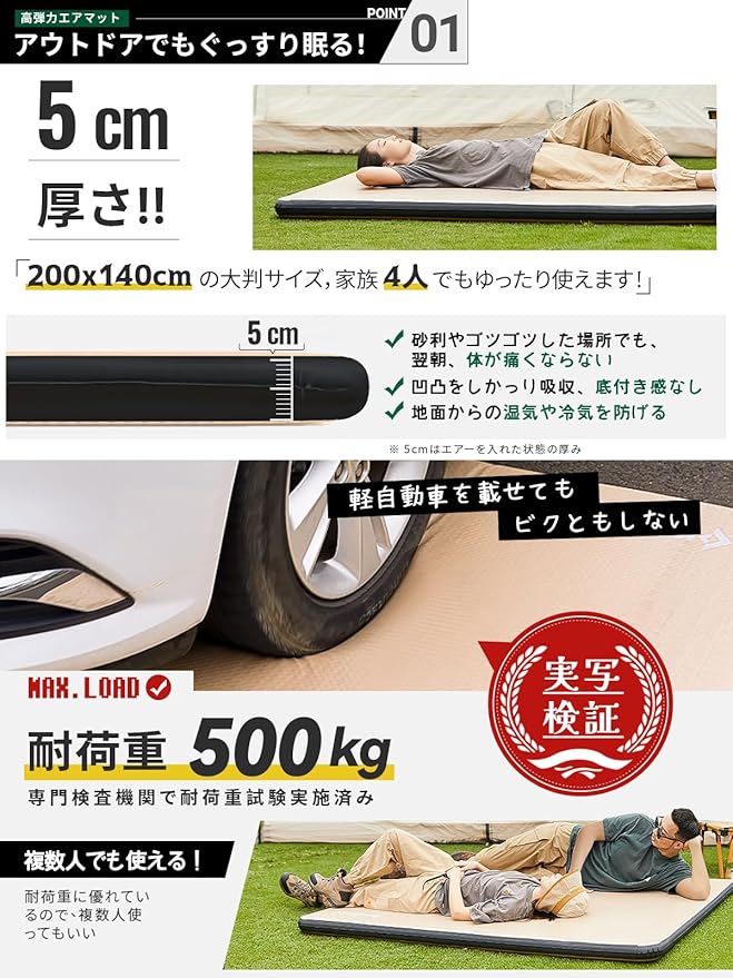 【高級TPUドロップステッチ素材】キャンプマットの表層にはTPU素材を使用しており、耐摩耗性と静電気防止性に優れ、さらに環境に配慮されています。内部には高圧強化線引き技術層が採用されており、5cm厚さで快適性を高めるだけでなく、非常に強力な衝撃吸収能力を備えています。