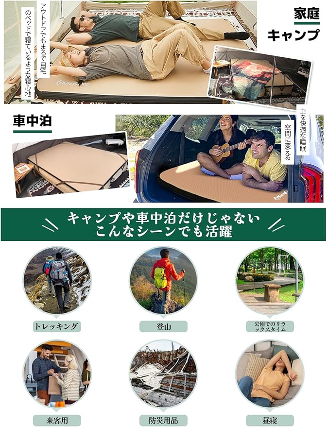 【様々なシーンで使用可能】マットには収納袋が付属しており、軽量設計で保管や持ち運びが非常に便利です。家庭での休息、アウトドアでのキャンプ、オフィスでの昼寝、車中泊、友人の宿泊など、さまざまなシーンで活用できます。