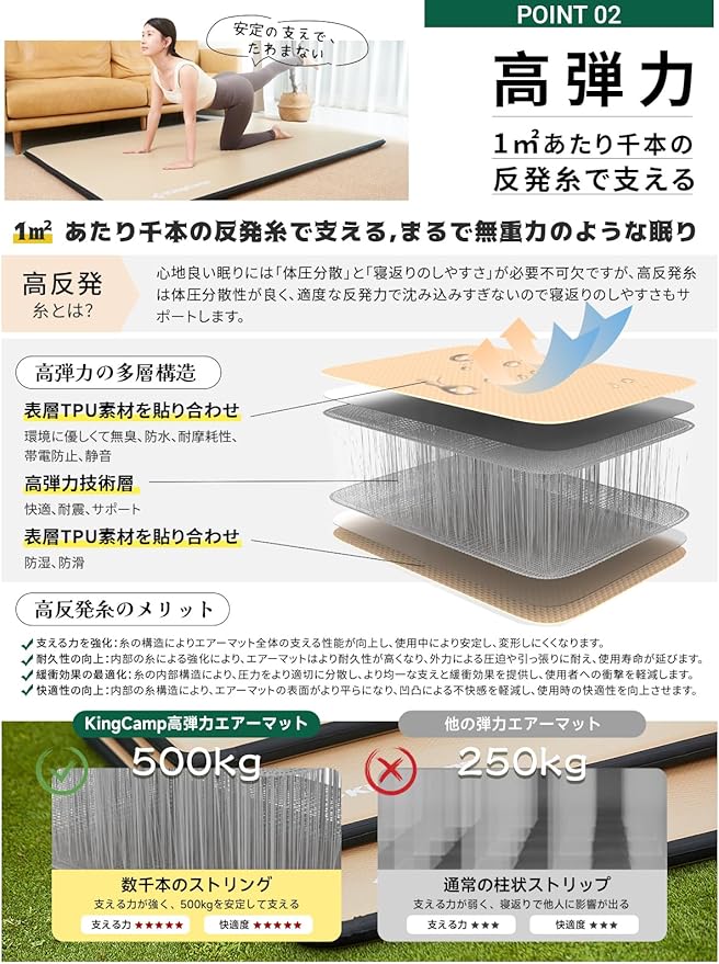 【耐荷重500kg&静音】1平方メートルあたり数千本の強化線がサポートし、圧力を効果的に分散し、高耐荷重を実現します。さらに、表面の多点サポート設計により、衝撃を緩和し、異音を軽減し、静かな睡眠をもたらします。