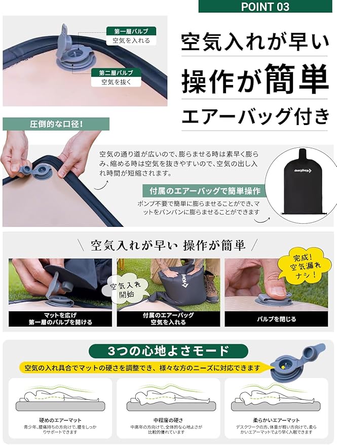 【空気入れ簡単&漏れ無し】インフレーターマットにはエアーバッグが付属しており、ポンプなしで簡単に膨らませることができます。さらに、2-in-1のバルブを備えており、自由に充気と放気ができ、漏れる心配はありません。