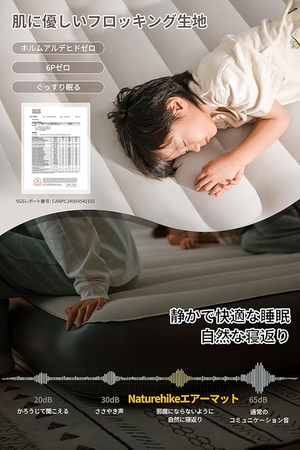 【枕付きデザイン】表面はフロック加工したPVCを採用し、柔らかな肌触りで、通気性・防水性・保温性もよく、静電気防止で、静かで快適な睡眠を実現し、邪魔にならないように自然に寝返りできます。エアーマットの中央部は厚さ25cm、頭部分は枕として10cm高くなっており、頭と肩をしっかり支えることができるので、枕を買い足す必要はありません。