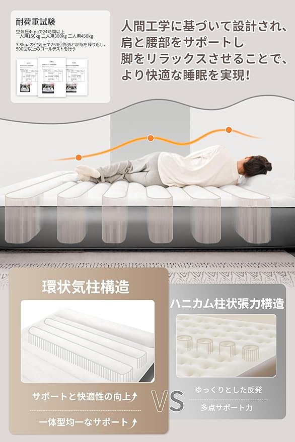 【抜群な寝心地】点状構造から、よりサポート性の高い環状気柱構造にアップグレードし、力を均一に受けて、構造が安定で荷重は約150~450kgに達します。人間工学基づいて、肩と腰部をサポートし、脚をリラックスさせることで、より快適な睡眠を実現します。