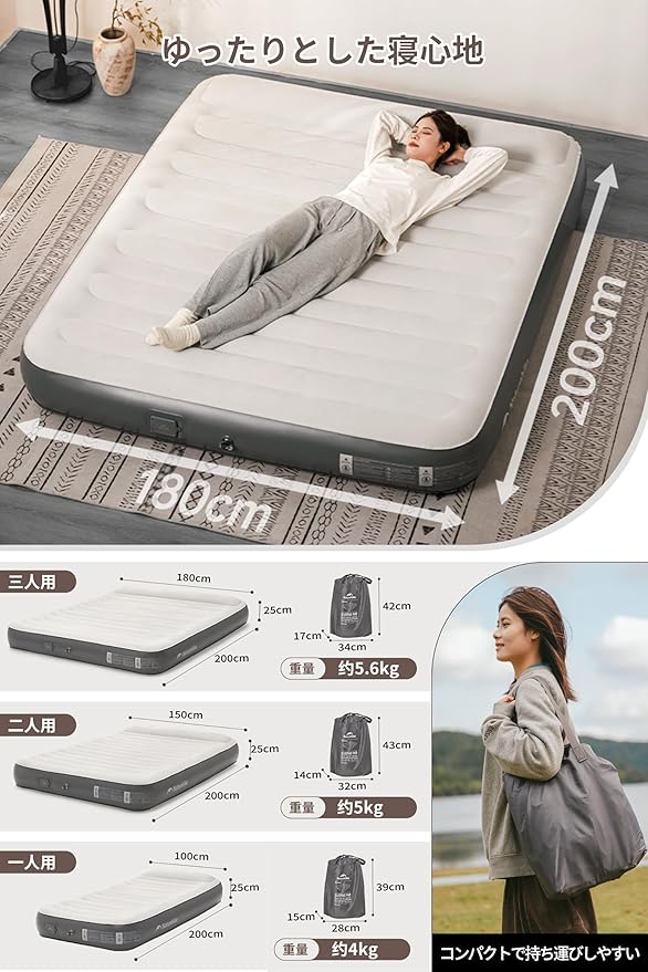 Naturehike 公式 エアーベッド 電動ポンプ内蔵 枕付き 電動ベッド エアーマット キャンプ 1/2/3人用 来客用 25cm 極厚 簡易 厚手 お昼寝 防災 寝具 スピード膨張 耐久 安定 高反発 快適な寝心地 | KAZESHOP