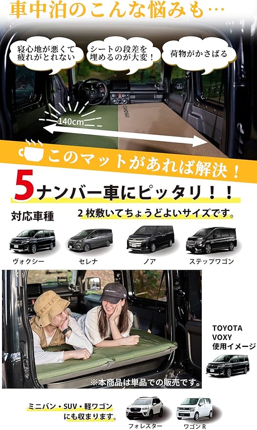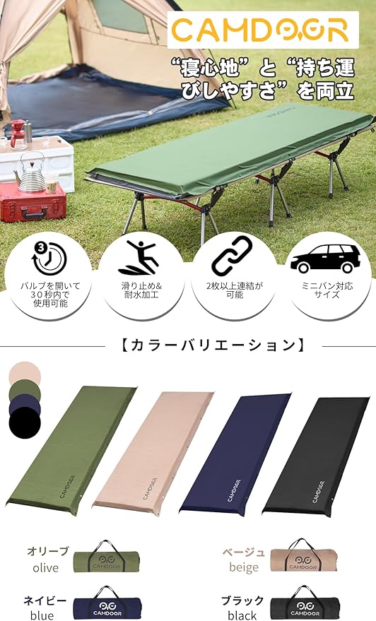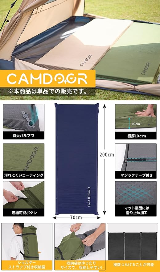 3 つの利点: ①幅広のキャンプ マット:幅70cm(クッション幅65)。 市販されている他のエアマットよりも幅が広いです。②当社のキャンプマットには最新の2-in-1バルブが装備されています。工具を使わずに自動で膨張します。約30秒空気を入れて使用します。 女性でも簡単に使えます。③厚みのエアーマット:8CMと10CMの厚さで車内の段差や地面のデコボコを解消!人間工学に基づいてデザインされたキャンプマットは深い睡眠を促進し、体の自然な形状を維持し、ソフトな手触り、高反発。