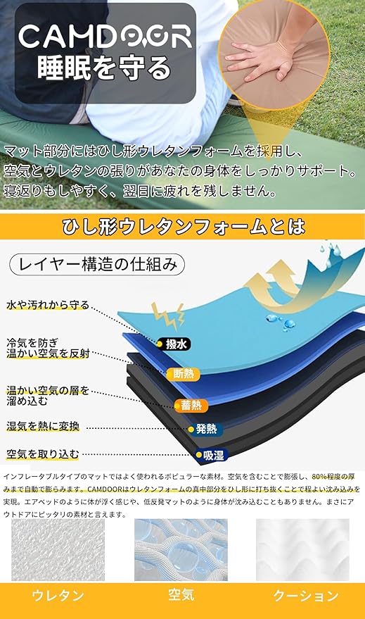 【市場とは異なる堅牢な素材】令和7年最新進化版です!エアマットレスの正面は210T複合PVC+高反発スポンジ素材。高い強度の防水性を持って、汚れてもタオルで拭き取れば大丈夫です。人間工学に基づいてデザインされたキャンプマットは深い睡眠を促進し、体の自然な形状を維持し、ソフトな手触り、高反発。 地面との接触はありません!ぐっすりと眠ることができます。自動膨張式スリーピングパッドの裏面は滑り止めです。 どんなシーンでもしっかり使えます。 エアマットの裏側はポリエステルで、太い枝を使って強く切っても破れにくい素材です。