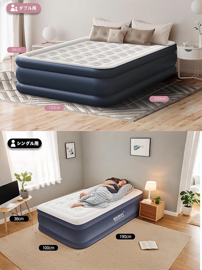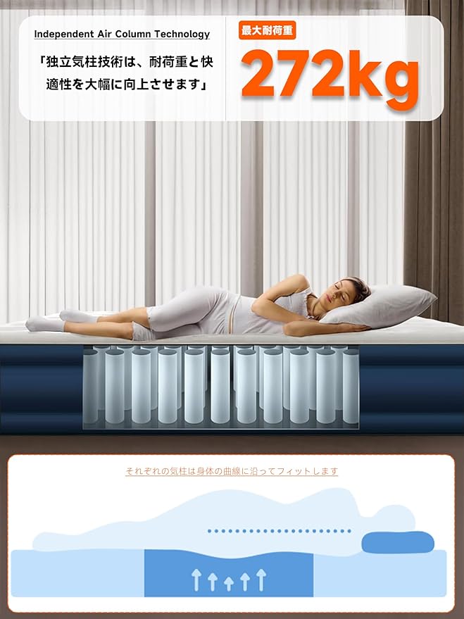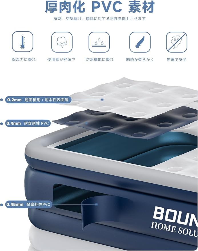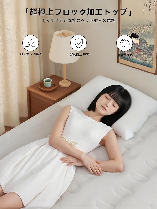 【超高いデザイン性+快適な睡眠設計】:この製品の表面は薄い色の肌に優しい植毛生地を採用しており、手触りが細やかです。側面は濃い色のPVC素材で、滑り止め、防水、耐磨耗の性能を併せ持っているだけでなく、植毛生地とも調和よく組み合わさり、全体的な外観が美しく調和が取れています。快適な睡眠を実現する設計については、特殊な蜂の巣構造と内蔵された21本のエアーカラムが組み合わさっており、人間工学に適合しています。体の圧力を均一に分散し、体の自然な曲線にフィットするだけでなく、仰向け、うつ伏せ、横向きなど多様な睡眠姿勢に対してしっかりと支えを提供し、脊椎と腰の負担を軽減し、雲の上のような快適な睡眠体験をもたらします。美しい外観と巧妙な設計が相補的に作用し合い、デザイン性と快適さが完璧に融合しています。