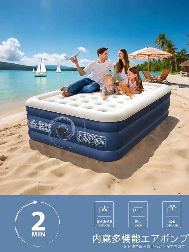 【内蔵式多機能エアポンプ】:この製品には専用の電動エアポンプが付属しています。充気と排気はワンタッチで完了し、強力な気流がマットレスに素早く注入され、わずか 1 分でマットレスがすぐに成型されます。緊急時の使用でも日常の収納でも、あなたの時間とエネルギーを節約します。エアポンプには思いやりの 3 種類の異なる口径の充気口が付いており、さまざまな充気製品に充気することができます。小さな浮き輪から大きなエアソファまで、どんなものでも簡単に対応できます。また、エアポンプの底部には照明モジュールが組み込まれています。エアポンプの上部には折りたたみ式の持ち手が付いており、マットレスから取り出して高い所に吊るすのが便利です。夜間の使用シーンを考慮し、照明モジュールには柔らかい光、明るい光、そして SOS 点滅灯の 3 種類のモードが特別に設定されています。キャンプ時には、これを照明に使用することができるだけでなく、突発的な状況では SOS 点滅灯モードを使って救命信号を送信し、夜間の安全を守ることができます。