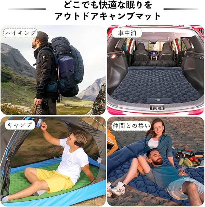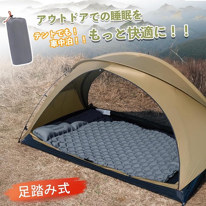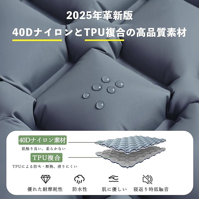 【防水性・耐久性抜群】エアマットは強化された40Dナイロン素材と多層の防水・耐久TPU素材で、高強度と防水性を兼ね備えています。雨が降っても、タオルで拭くだけで使用できます。