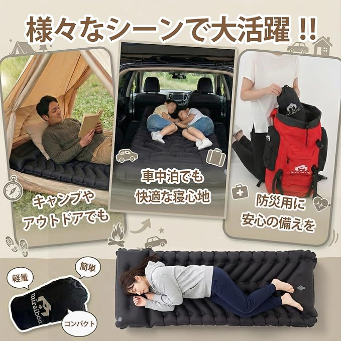 【多彩なシーンで活躍】 キャンプ・アウトドア:テント泊やタープ泊での快適な睡眠をサポート。コットの上に敷けば、さらにクッション性が向上します。 車中泊:シートの段差を解消し、フラットで快適な寝床を確保。長距離ドライブの休憩や、車中泊旅行に最適です。 防災・緊急時:避難所などでの簡易ベッドとして。コンパクトに収納できるので、防災リュックに常備しておくと安心です。 来客用:急な来客時の予備寝具として。使わない時はコンパクトに収納できるので、収納スペースを取りません。 オフィスでの仮眠:休憩時間の仮眠用マットとして。疲労回復に効果的です。
