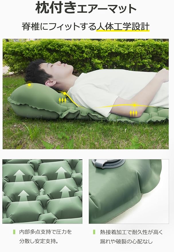 エアーマット キャンプ 足踏み式 【2025新開発&25秒膨らむ】 車中泊マット 枕が付き アウトドア 防災 寝袋 R値4.0 厚手 防水防潮 災害用 軽量 持ち運び便利 簡単収納 収納袋付き 日本語取扱説明書 オリーブグリーン | KAZESHOP