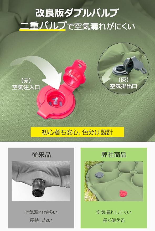 【初心者にも優しい・耐重設計】充気口と排気口は色で区別されており、赤は充気口、灰は排気口と一目でわかります。初心者でも簡単に使用可能です。熱接合技術によるエッジ加工で耐久性が向上しており、複数人が使用しても耐えられる設計です。最大耐荷重は200kgで、家族や友人と一緒に使っても安心してアウトドアを楽しめます。