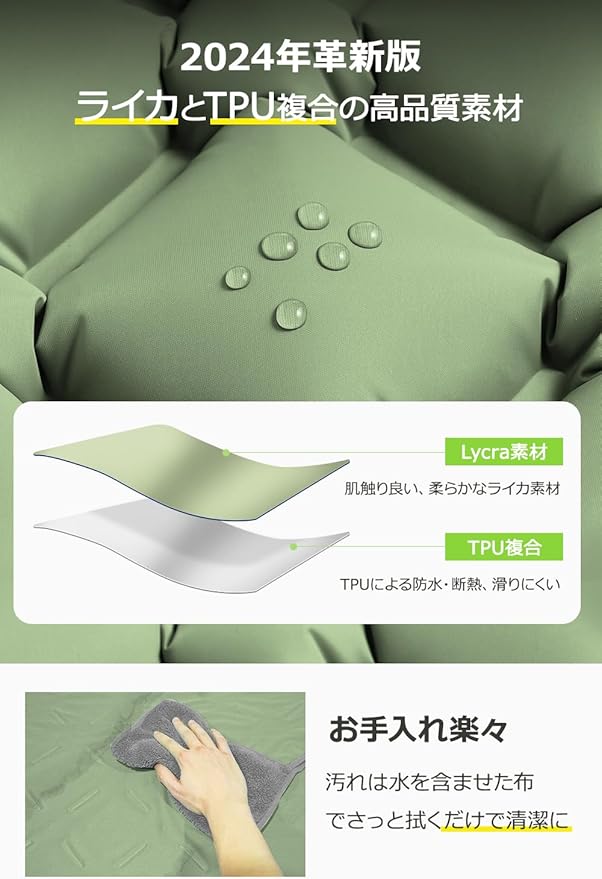 【耐久性&快適性を兼ね備えたデザイン】ナイロンよりも柔らかいライカ布地を使用し、TPUの防水防湿コーティングが施されています。これにより、耐摩耗性が高く、裂けにくくなっています。突然の雨でも安心、表面をサッと拭くだけで清潔を保てます。いつでもどこでも清潔で快適な睡眠を提供。キャンプや登山、車中泊や緊急時の避難所でも、このエアーマットがあれば安心です。