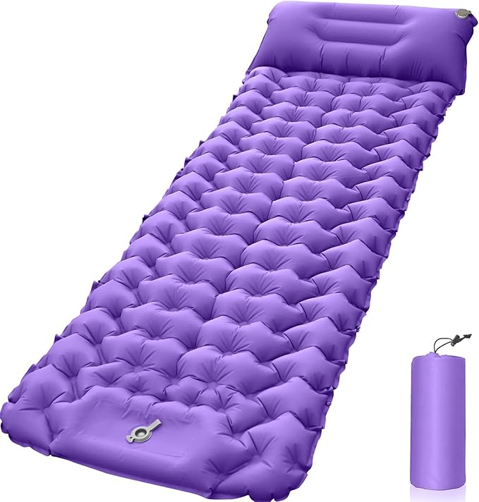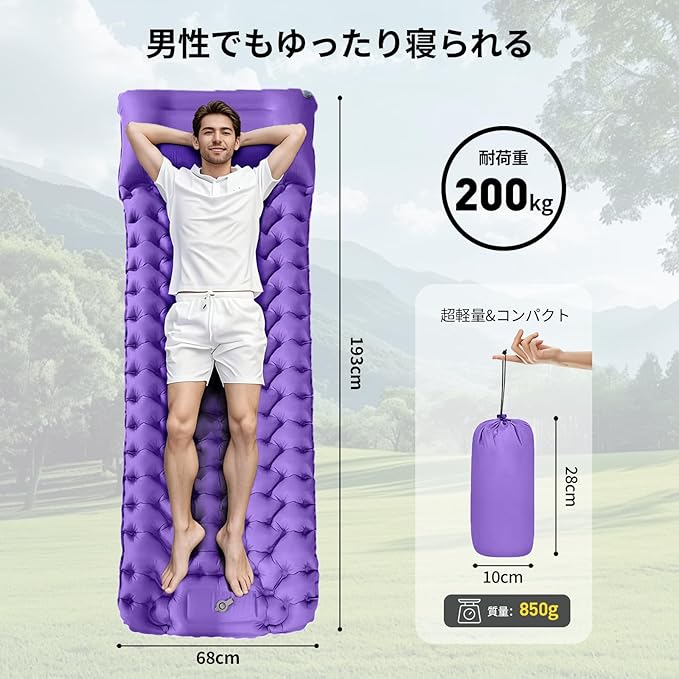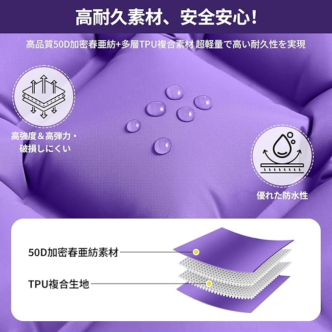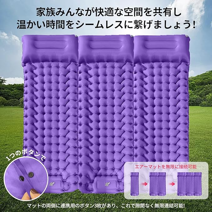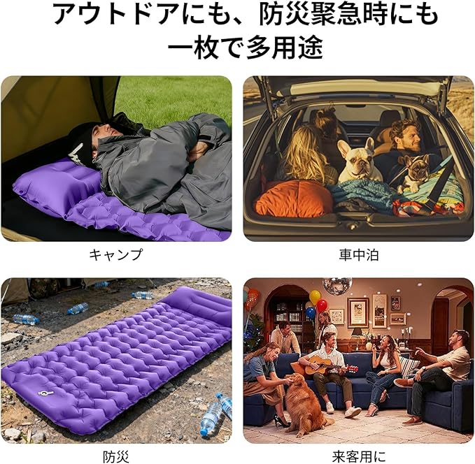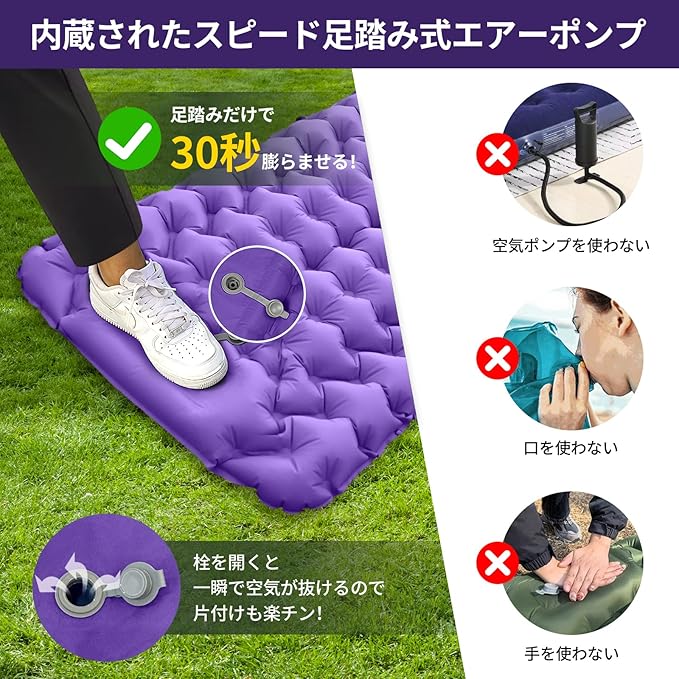 エアーマット キャンプ マット 足踏み式 8cm厚 850g超軽量 枕付き 無限連結可能 車中泊 防災 超高速膨張 コンパクト収納 持ち運び便利 防水 寝袋 災害 登山 テント用 キャンプ用品 収納袋付き 紫 | KAZESHOP