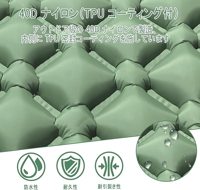 【防水・耐用・静音素材!アウトドアに最適】インフレーターマット(エアマット / キャンプマット)の表面は 40D ナイロン + 多層防水 TPU で、雨天でもタオルで拭くだけで使用可能。裏面はポリエステル素材で破れにくく、空気の流れ音や生地の摩擦音も少なく、朝まで静かに眠れる静音性を実現します。