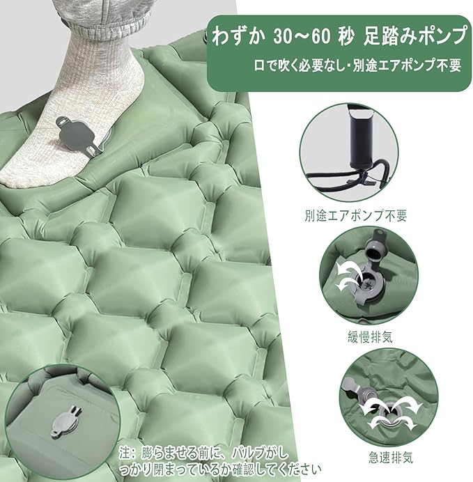 【30 秒足踏み急速膨らみ!ポンプ不要】このエアーベッド(キャンプマットレス / インフレーターマット)は足部に内蔵エアポンプが付いており、別途ポンプを購入する必要がありません。30~60 秒で完全に膨らみ、空気の放出はわずか 1 秒で完了。アップグレードダブルバルブで空気漏れを防ぎ、夜中のマットのへたりを心配する必要がなく、使用中は安心です。