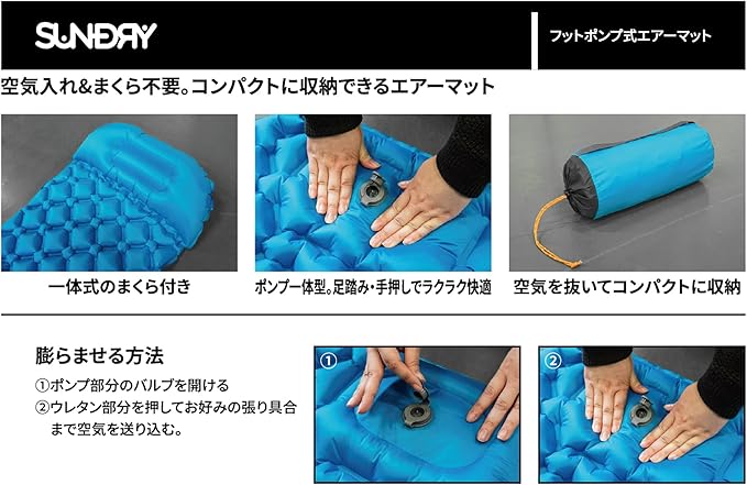 ●足踏みポンプ内蔵で簡単に空気入れができる●枕付き●空気を抜けばコンパクトに収納可能
