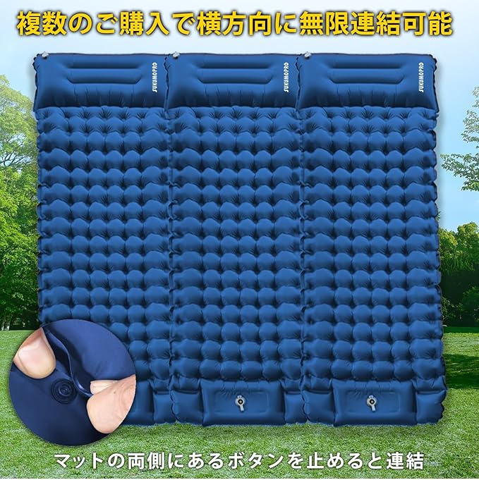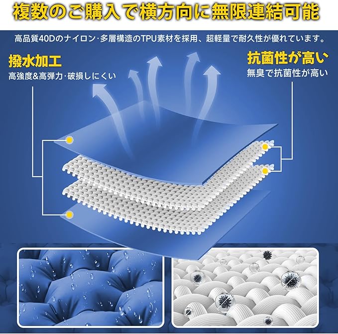 【複数連結可能・耐重設計】 エアーマットの両側には接続ボタンが付いており、両側のボタンを閉じるだけで、隙間なく複数のエアーマットが無限に接続できます。 専用の収納袋が付いているので、収納スペースをとらず、持ち運びも簡単です。 家族や友人と一緒に使っても安心してアウトドアを楽しめます。