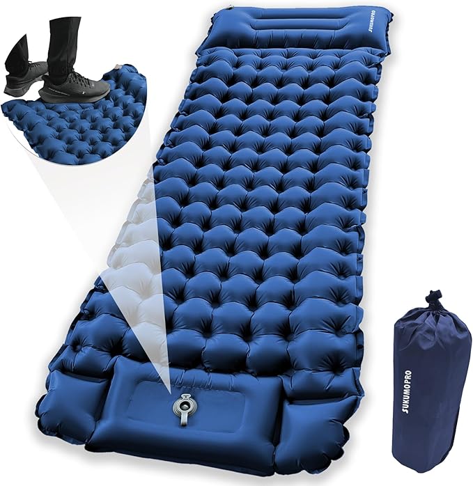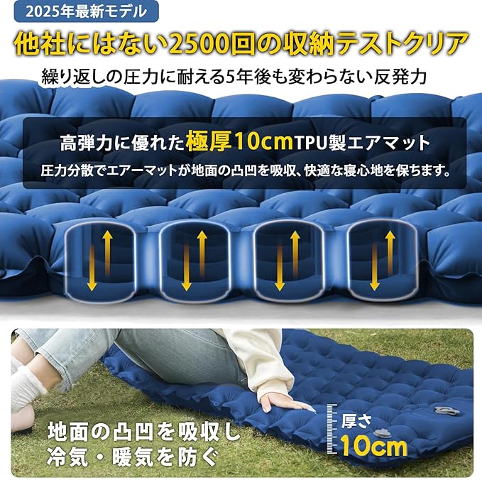 エアーマット インフレーターマット 厚さ10cm 厚手 ベッド キャンプ 足踏み式 車中泊 防災 防水 シングル コンパクト マット 60秒 無限連結可能 R値4 枕付き 軽量 来客用 補修テープ付 ネイビーブルー (1個) | KAZESHOP
