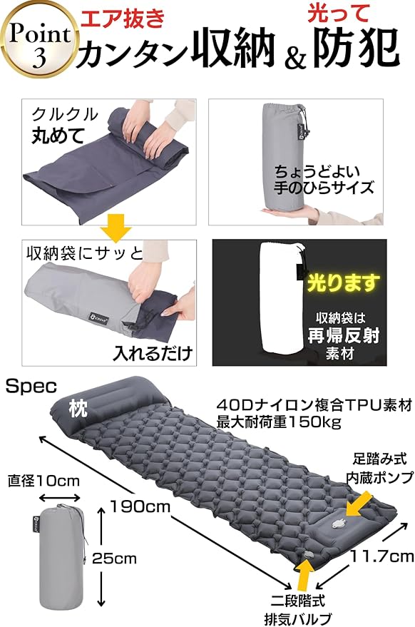 【商品スペック】 ポンプ不要 補修シール付 反射生地収納袋付 ・重さ 0.6㎏ ・サイズ 190*60*5-10cm ・素材 40Dナイロン複合TPU ・最大耐荷重150㎏