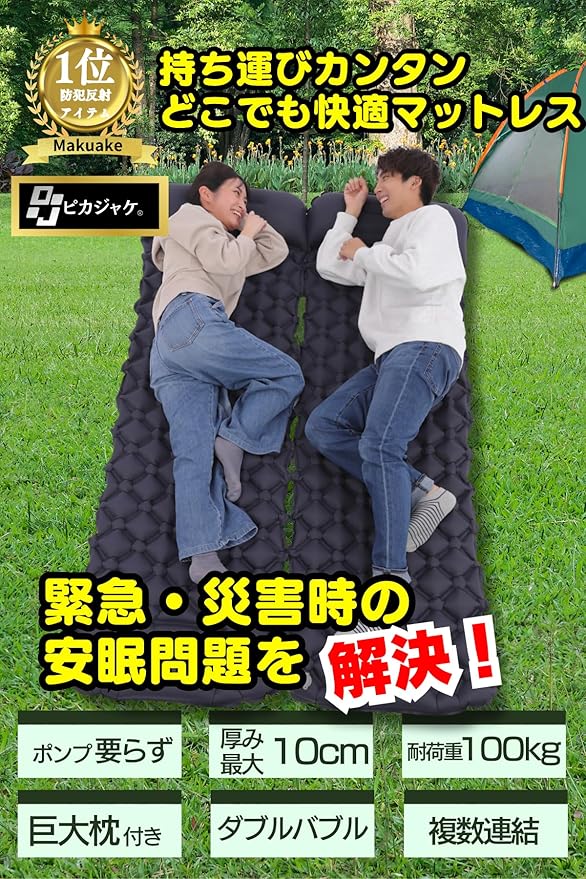 【枕付き、マット連結OK】複数のマットを連結可能なので、広く使いたい場合、家族での使用など快適にご使用可能です。元気いっぱいのお子様や車中泊でも快適にお過ごしいただけます。防災時の睡眠問題は社会の課題ですがポンプ不要のエアーマットを防災対策として防災リュックに入れることをオススメします。来客時の簡易ベッドとしてもご使用いただけます。