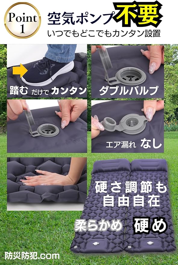 【足踏み式でカンタン設置、空気入れ不要】足踏みポンプを内蔵し、約60秒でマットを膨らませることが可能。別に空気入れポンプを持参する必要はありません。大変な口での給気も不要です。枕付きで安眠効果が期待できます。※使用方法・収納方法動画あり