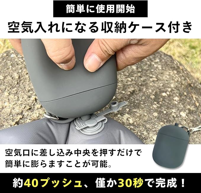【エアポンプ一体型収納ケース】 40回手で押すだけ僅か30秒で簡単に膨らむエアポンプ付き。排気は3秒で完了し、手間いらずの便利設計。