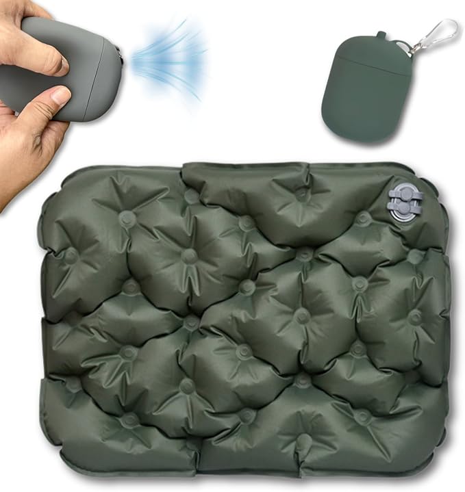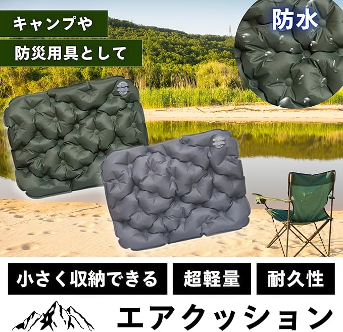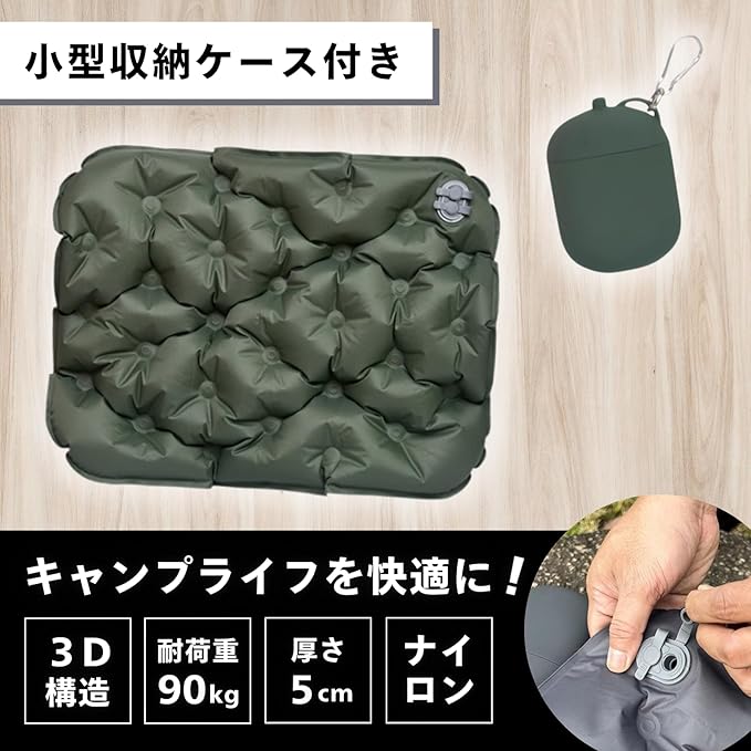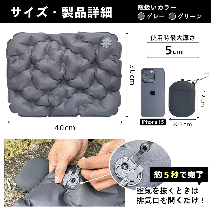 【快適設計】3D構造で長時間でも疲れにくい! エアーマットは、⼈間⼯学に基づいた花型の3D凹凸デザインを採⽤。⾻盤や臀部の圧⼒を均等に分散し、⻑時間座っても疲れにくい仕様です。厚さ5cmの⾼反発クッションがしっかりとサポートし、変形しにくく安定感抜群!アウトドアやスポーツ観戦、ピクニックなど、どんなシーンでも快適な座り⼼地を提供します。 【⼀体型エアポンプで簡単膨張&3秒排気】 収納ケースがエアポンプとして機能する画期的な設計!空気⼝に差し込み、中央を押すだけで約30秒ほどで膨らませることが可能です。従来の⼿押しタイプと異なり、より効率的かつ衛⽣的に空気を⼊れることができます。さらに、空気を抜くときもブリーダーバルブを開くだけで約5秒で排気完了!素早く収納できるため、持ち運びやすく、アウトドアシーンでの使い勝⼿も抜群です。 【防⽔&耐久性抜群のナイロン素材】 表⾯には耐摩耗性に優れた40Dナイロン、内部にはTPU防⽔素材を採⽤。⾬や湿気、汚れにも強く、アウトドア環境でも安⼼して使⽤できます。さらに、⾼い耐久性を誇るため、地⾯がでこぼこしている場所や、濡れた草地でも問題なく利⽤可能。汚れてもサッと拭き取るだけでお⼿⼊れ簡単です。 【超軽量&コンパクト – 持ち運びに便利】 収納時のサイズはわずか 8.5 12 5cm、重さ約 170g と超軽量!⼩型収納ケースにはカラビナが付属しており、バッグや⾃転⾞、リュックに吊るして持ち運ぶことができます。キャンプや登⼭、ピクニックはもちろん、スポーツ観戦やアウトドアフェスなど、あらゆる場⾯で活躍します。 ️ 【優れた耐荷重&⻑期間使⽤OK】 耐荷重90kg の⾼強度設計で、⼤⼈も安⼼して使⽤可能。しっかりとした作りで、何度使ってもヘタりにくく、⻑期間にわたって愛⽤できます。 ️ 【多用途で大活躍!】 キャンプ・登⼭・ハイキング での休憩に 花⾒・ピクニック・運動会 での快適な座り⼼地 スポーツ観戦・アウトドアフェス での便利な携帯クッション 災害時や防災⽤グッズ としても最適! ⛺ こんなシーンにおすすめ! ✅ キャンプや登山での休憩用クッション ✅ 野外フェス・スポーツ観戦時の座布団代わり ✅ 花見・ピクニックで快適に座れるアウトドアマット ✅ 非常用・防災グッズとしての備えにも 商品仕様 梱包サイズ: 13.7 10.8 5.2 cm 本体サイズ: 40cm 30cm(使用時最大厚さ 5cm) 収納サイズ: 8.5 12 5cm 重量: 約170g 素材: ゴム、40Dナイロン、TPU防水コーティング 耐荷重: 90kg カラーバリエーション: グリーン / グレー(2色展開) 機能: クイック膨張、お手入れ簡単、ポンプ内蔵、クイック収縮、コンパクト お手入れ方法: 手洗いのみ 【今すぐアウトドアを快適に!】 持ち運びラクラクなコンパクト設計&高耐久エアーマットで、どこでも快適な座り心地を!キャンプ、登山、ピクニック、スポーツ観戦、防災用に最適です。