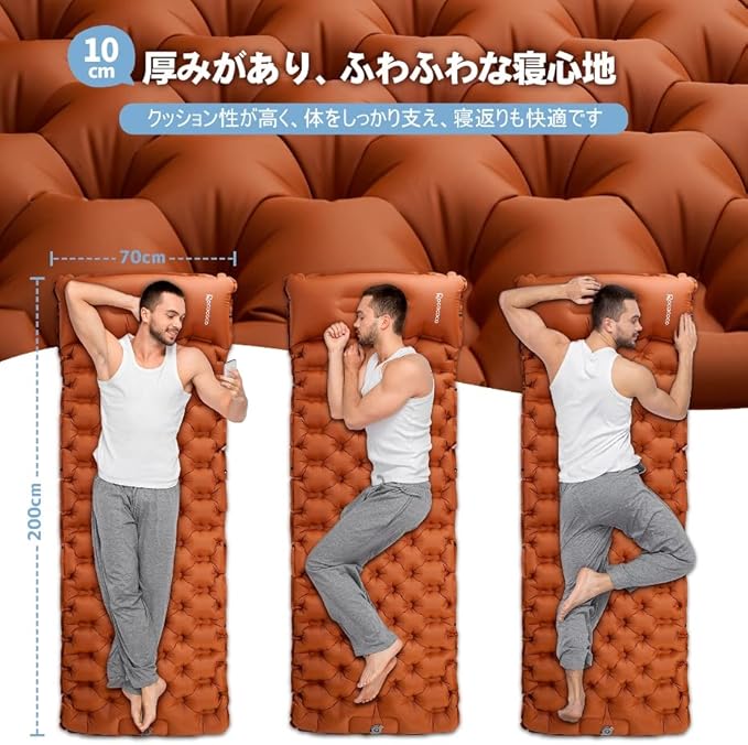 エアーマット Rocacoco 10cm厚さ 幅広70㎝ エアマット キャンプマット 足踏み式 幅広厚手 車中泊 軽量 枕付き 連結可能 コンパクト 防水 防災 40D+TPU キャンプ用品 4カラー (Orange) | KAZESHOP