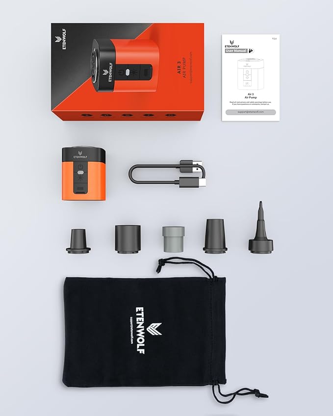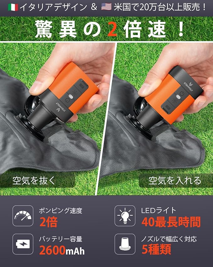 2倍大きなバッテリー容量:2600 mAhのリチウムバッテリーを搭載したETENWOLF AIR 3電動空気入れは、フル充電で最大16枚のスリーピングパッドまたは4つのインフレータブルスイミングプール(147cm*33cm)を膨らませることができます。AIR 3エアーポンプは、タイプCのクイックチャージャーにも対応しており、より速く充電できます。