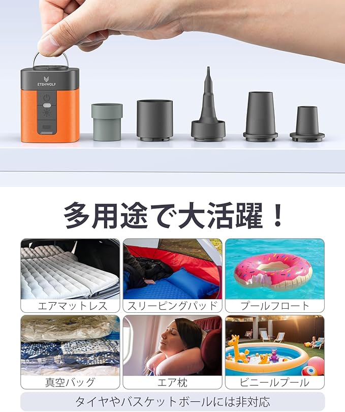 5つのノズル&多用途:5つのノズルが付属しており、AIR 3エアーポンプ キャンプ、エアマット、インフレーターマット、キャンプマット、プールフロート、スリーピングパッド、スイミングリング、インフレータブル家具、その他のインフレータブルキャンプ用品やおもちゃなど、ほとんどのインフレータブル製品に対応しています。