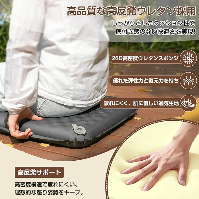 ⛺【高品質素材で耐久性抜群!】アウトドア 座布団の表面は上質な綿素材を採用し、肌触りが柔らかく、通気性に優れ、蒸れにくいです。内部は26D高密度ポリウレタンを採用し、空気とポリウレタンの張力を利用して安定したサポート力を発揮します。使用時は地面のざらつきが体に伝わらず、底付き感もありません。また、冬場に気になる地面の冷気を効果的に遮断し、快適な座り心地を実現します。