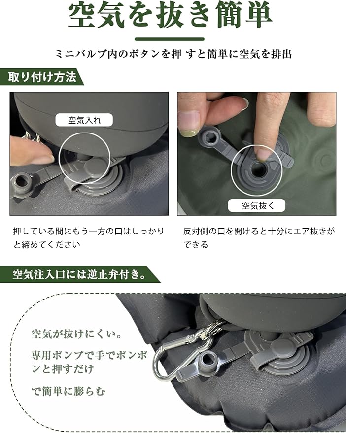 【1つで2役&エアーバルフ徹底改良】従来のエアークッションとは異なります。Funttoのエアマットシリコン収納ボックスは、エアクッションを収納できるだけでなく、シリコンボックス自体がエアポンプになります、余計な空気入れ道具が不要、。エアポンプを手で約30回押すだけで、素早く空気が充満する。エアクッションは2つのエアバルブにアップグレード。左侧から空気を入れ、右侧は排気孔で、空気を入れる時は、右の排気孔を閉じて、ポンプで空気を入れます。旧モデルとの比較、バルブ中央の赤いボタンを押す必要がなく、右側の排気バルブを開ければ簡単に空気を抜くことができる。