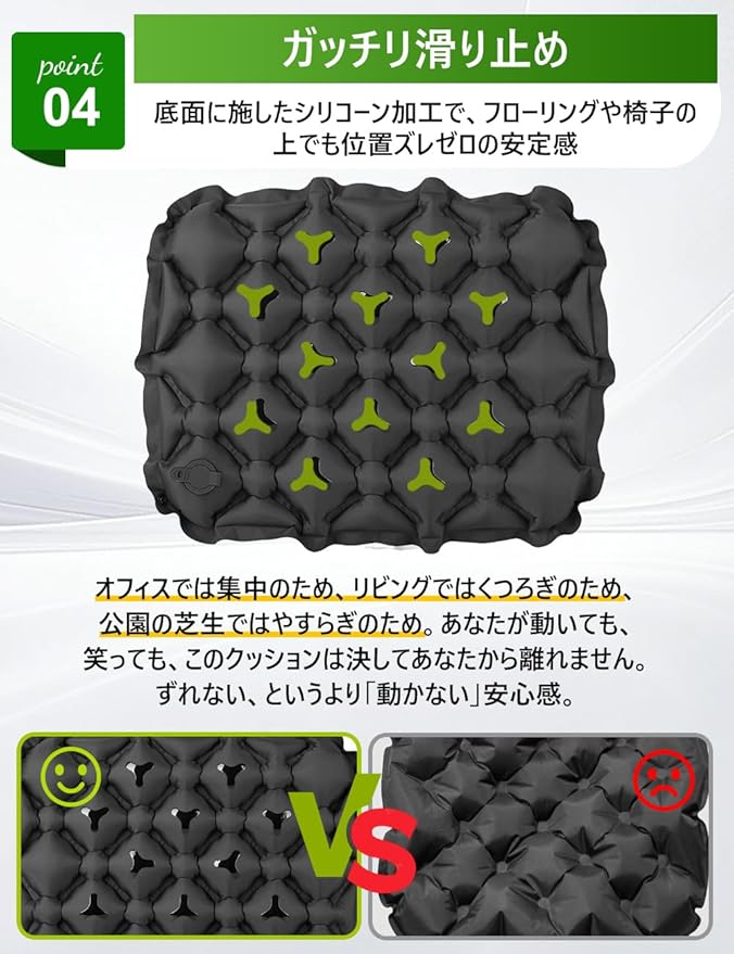 【しっかり滑り止め底面】ナノシリカゲルを配合した滑り止め加工を底部に施しているので、芝生や傾斜地でもクッションがずれにくく、安定した場所をキープ。安心してゆったりと座り続けられます。