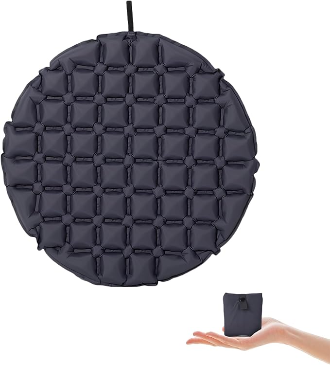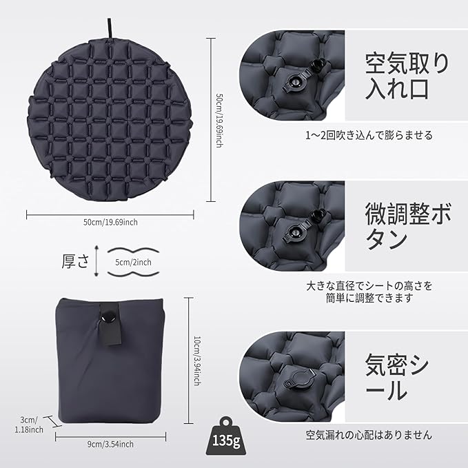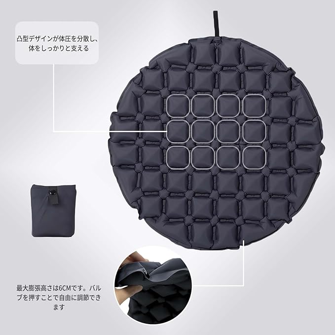 【人間工学に基づいたデザイン】エアークッション 入れるクッションは、長さと幅がそれぞれ50cmの円形で、大型フラットデザインです。エアークッション山登りの隆起したデザインにより、圧力を均等に分散し、体をしっかりと支えます。また、ざぶとん アウトドア空隙を増やし、通気性を大幅に向上させています。最大耐荷重200kgのアウトドア 座布団 膨らませるは、長時間座っていても空気が漏れる心配がなく、安心してアウトドアを楽しむことができます。