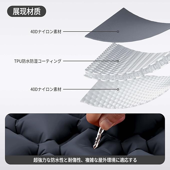 【高品質素材、耐久性】エアークッション 座布団の表面は、丈夫な40Dナイロンと耐久性のあるTPU素材の多層構造で、TPU耐水・耐湿コーティングが施されています。そのため、空気で膨らむ座布団は摩耗や引き裂きに対して高い耐久性があります、さまざまな複雑な状況に適応できる。突然の雨にも安全で、アウトドア 座布団 膨らませるの表面をさっと拭くは清潔に保つことができます。レジャークッションは外出中でも快適で便利に過ごせます。