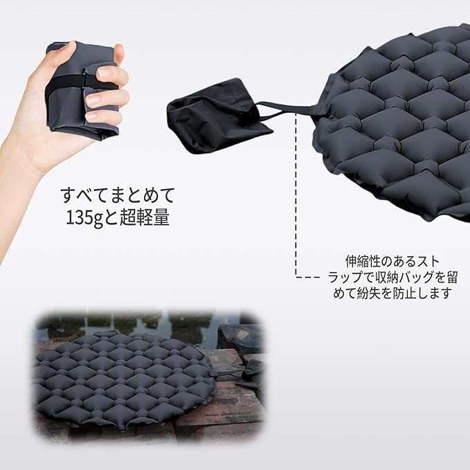 【コンパクトで軽量】エアーポータブルなクッションは、実用性と携帯性を兼ね備えた優れた製品です。その折りたたみ後のサイズは手のひらサイズにまで縮小でき、片手で簡単に保持することが可能です。具体的な寸法は 10 9 3 センチメートルとコンパクトで、重量もわずか 135 グラムと軽量設計が特長です。屋外でのピクニックやキャンプの時には地面の冷気や凹凸を緩和し、オフィスで長時間座っている時には腰や尻の負担を軽減し、家庭ではソファや椅子の上に敷くことで快適性を高めることができます。