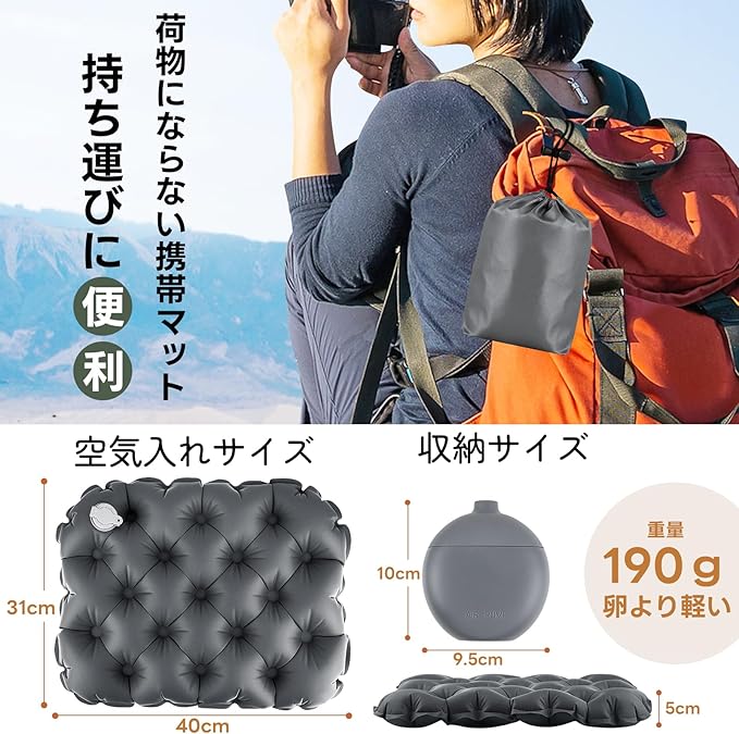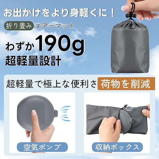 【190G超軽量エアークッション】収納後のエアークッションは190gの超軽量設計となり、カラビナでバッグに掛けるのも可能で、荷物になりません。1台2役極上な便利さを実現し、手軽くに旅行や移動中の疲れを癒せます!