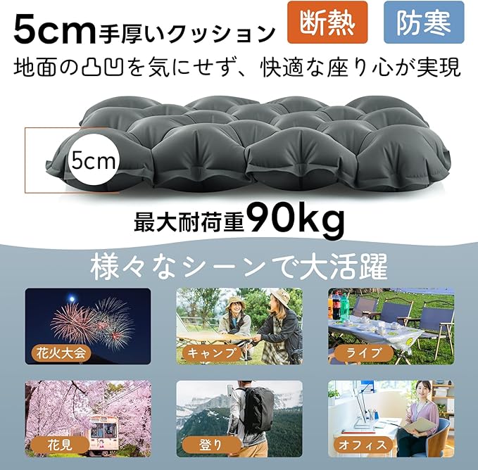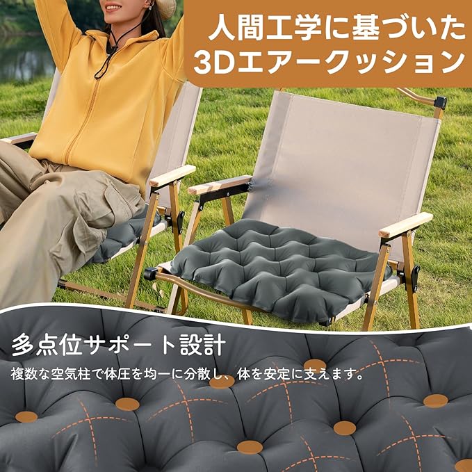【体圧分散3Dエアークッション】アウトドアマットは多点位サポート設計となり、内蔵した複数な空気柱が体圧を均一に分散し、通気性も優れます。5cm手厚いクッションが体を安定に支えて、地面の凸凹も気にせず、ふわふわ快適な座り心が実現します。40*31cmのたっぷりの大きさで子供から大人まで快適に使用できます。