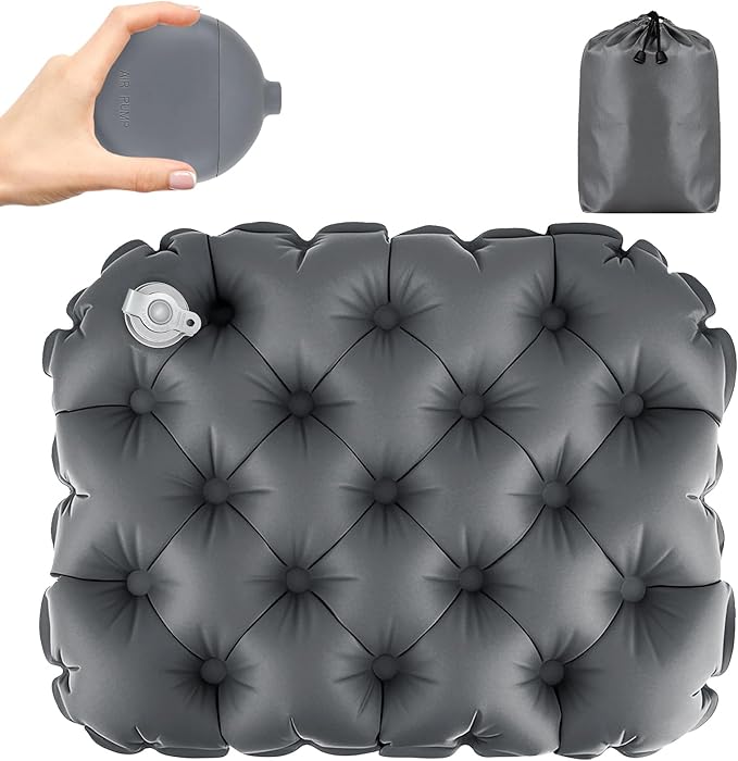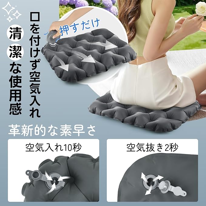 【10秒で膨らませる折り畳みエアーマット】エアー座布団の収納ケースは空気ポンプとして使用できる革新的な設計です。手でポンプを押すだけ10秒で簡単に膨らみ、口付けず衛生的です!空気抜けもワンタッチでき、コンパクトに折り畳んで、空気ポンプに収納できるので、旅をより身軽くにします。
