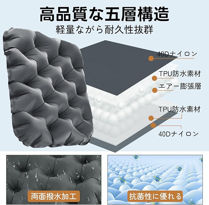 【断熱&防寒の五層構造】キャンプマットは撥水加工された40DナイロンとTPU防水素材の五層構造となり、キズ・衝撃に強く、湿気や冷気も遮断してくれます。耐久性に優れて、屋内外での使用に対応できるレジャーシートです。
