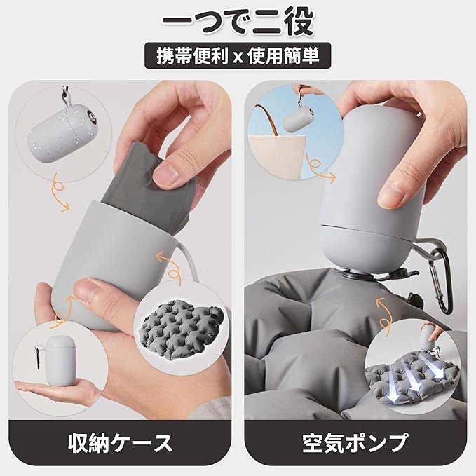【2WAY充気で簡単&衛生的】収納ケースがそのまま空気ポンプに早変わり。ポンプを約20秒押すだけで簡単に膨らみ、口をつけずに衛生的に準備完了です。従来のエアークッションとは異なり、余計な空気入れ道具は不要。また、大口径バルブにより、息を3~5回吹き込むだけの口吹き充気も可能で、好みや状況に合わせてお選びいただけます。