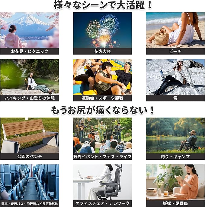 【3D構造でお尻が痛くならない】内部が複数の空気室に分かれた3D体圧分散構造により、臀部や腰部への圧力を均一に分散。厚み約5cmの空気層が地面の凹凸や冷たさを遮断し、レジャーシート並みのふかふかした座り心地を実現します。長時間の座席でもお尻が痛くなりにくく、花見、スポーツ観戦、長距離移動などに最適です。