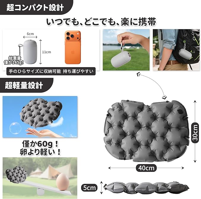 【驚きの軽さとコンパクトさ】わずか60gの超軽量で、折り畳むと手のひらサイズに。専用収納ケース(空気ポンプ兼用)に入れれば、11 6cmの超コンパクトな大きさになり、カバンやポケットにもすっきり収まります。アウトドアはもちろん、飛行機やバスでの移動時も荷物にならず、いつでも快適な座り空間を携帯できます。